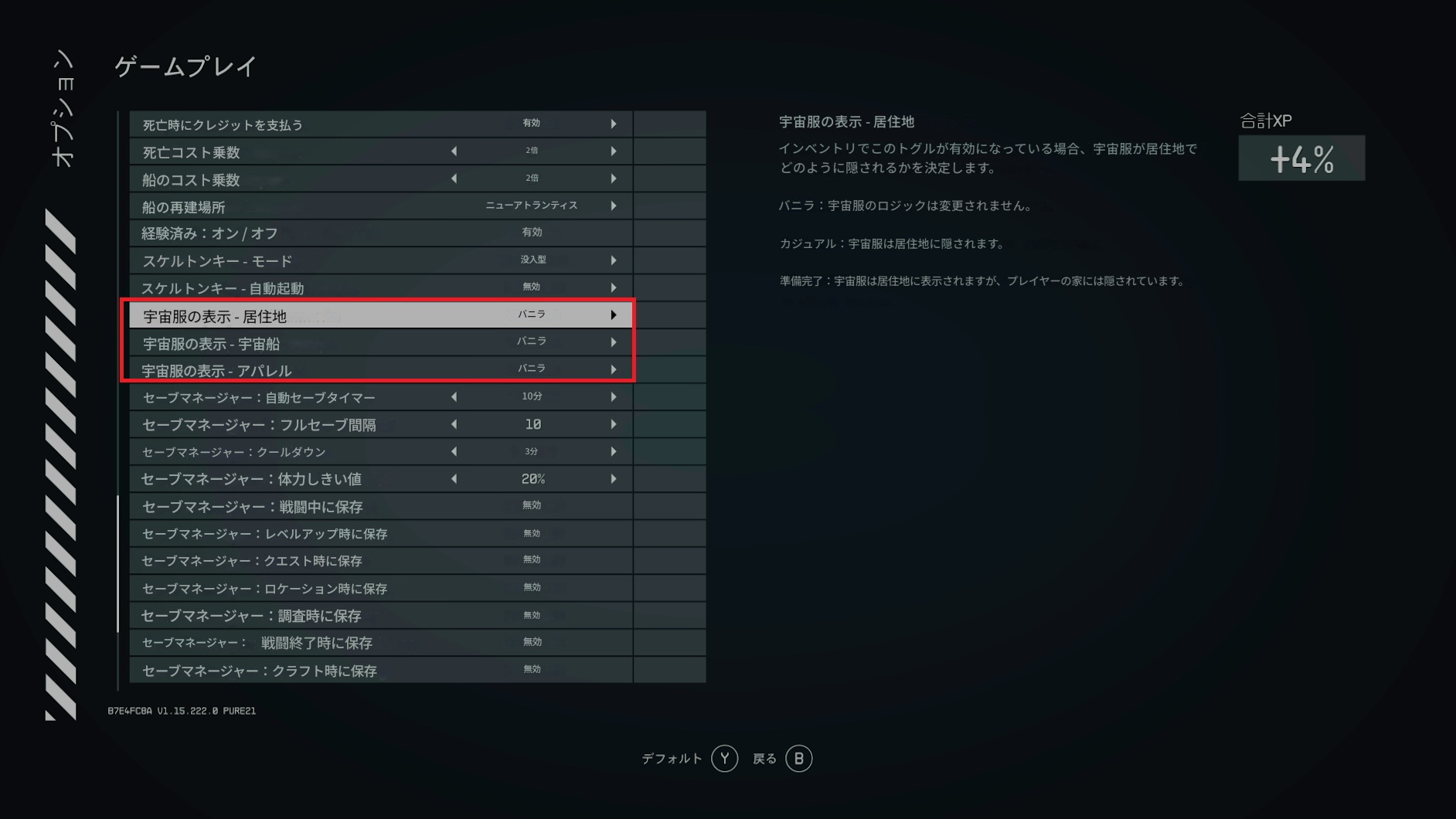 アパレル[プレイヤーのみ] • ボディアパレルアイテムを装備解除したときに宇宙服を強制的に表示するかどうかを選択します。