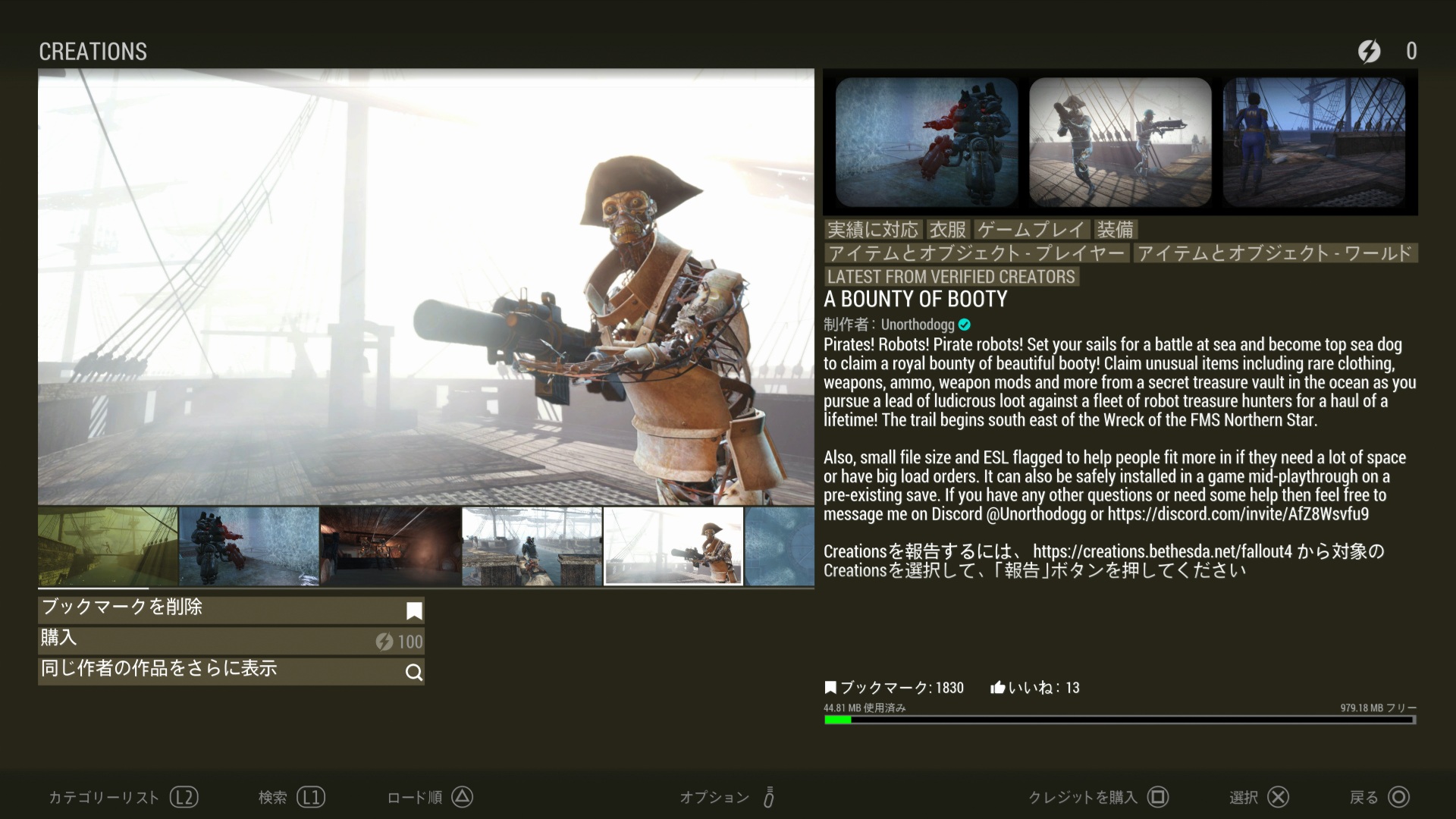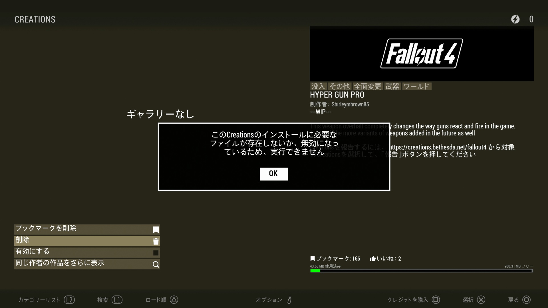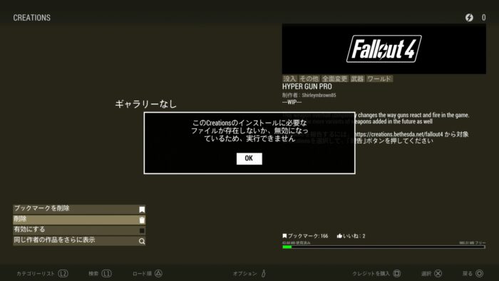 まだWIPだった…。やはりSkyrimやStarfieldと同じで、WIPはゲーム内Creationに表示されないようだ。