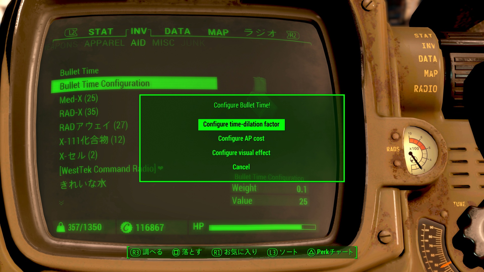 インベントリに追加されている「Bullet Time」を使うとオン/オフできる。設定。