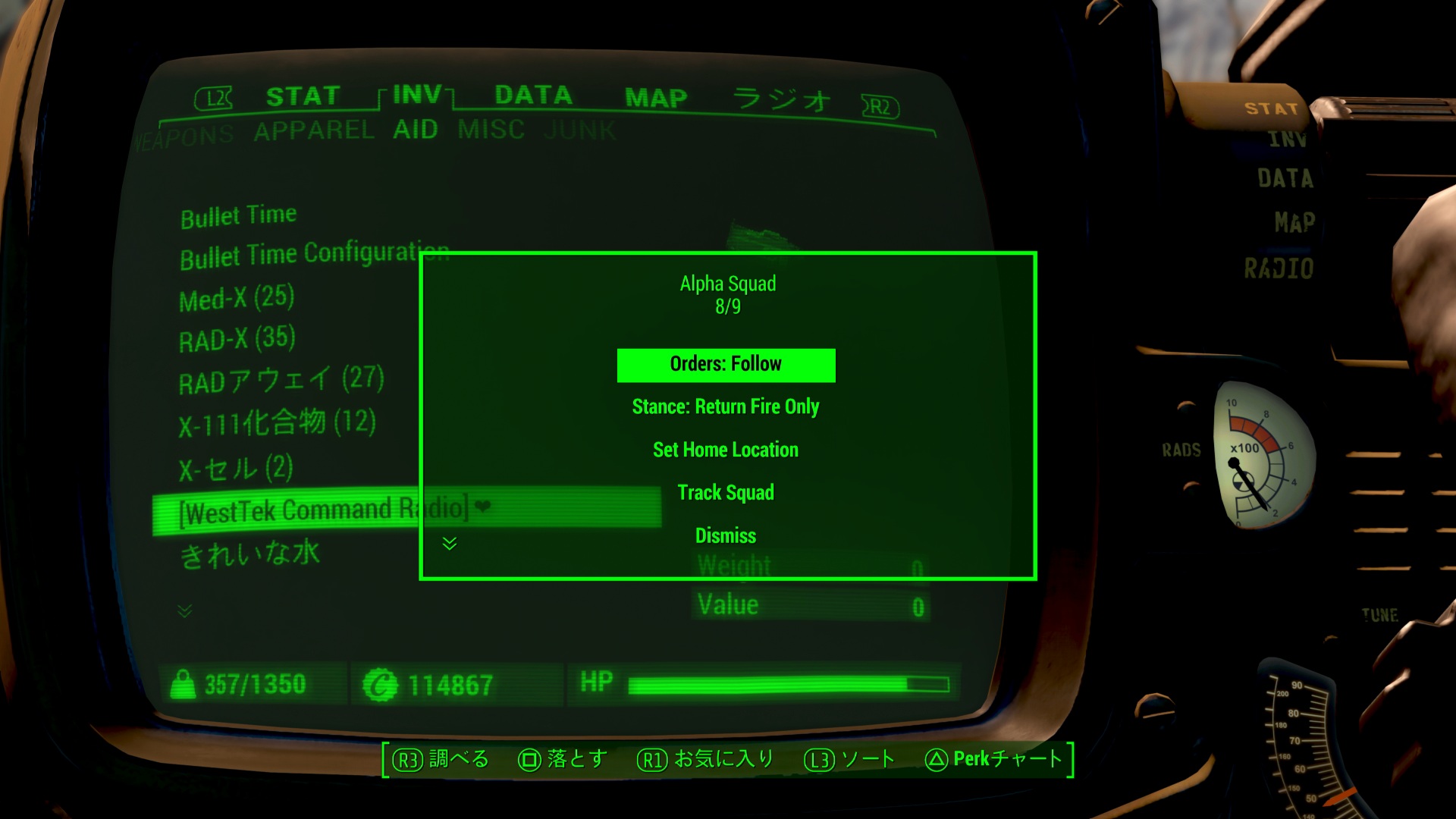 とりあえずFollowで付いてきてもらう。マーカーが付いてたVault111に向かうと居た。それぞれPERK習得もできるようだ。