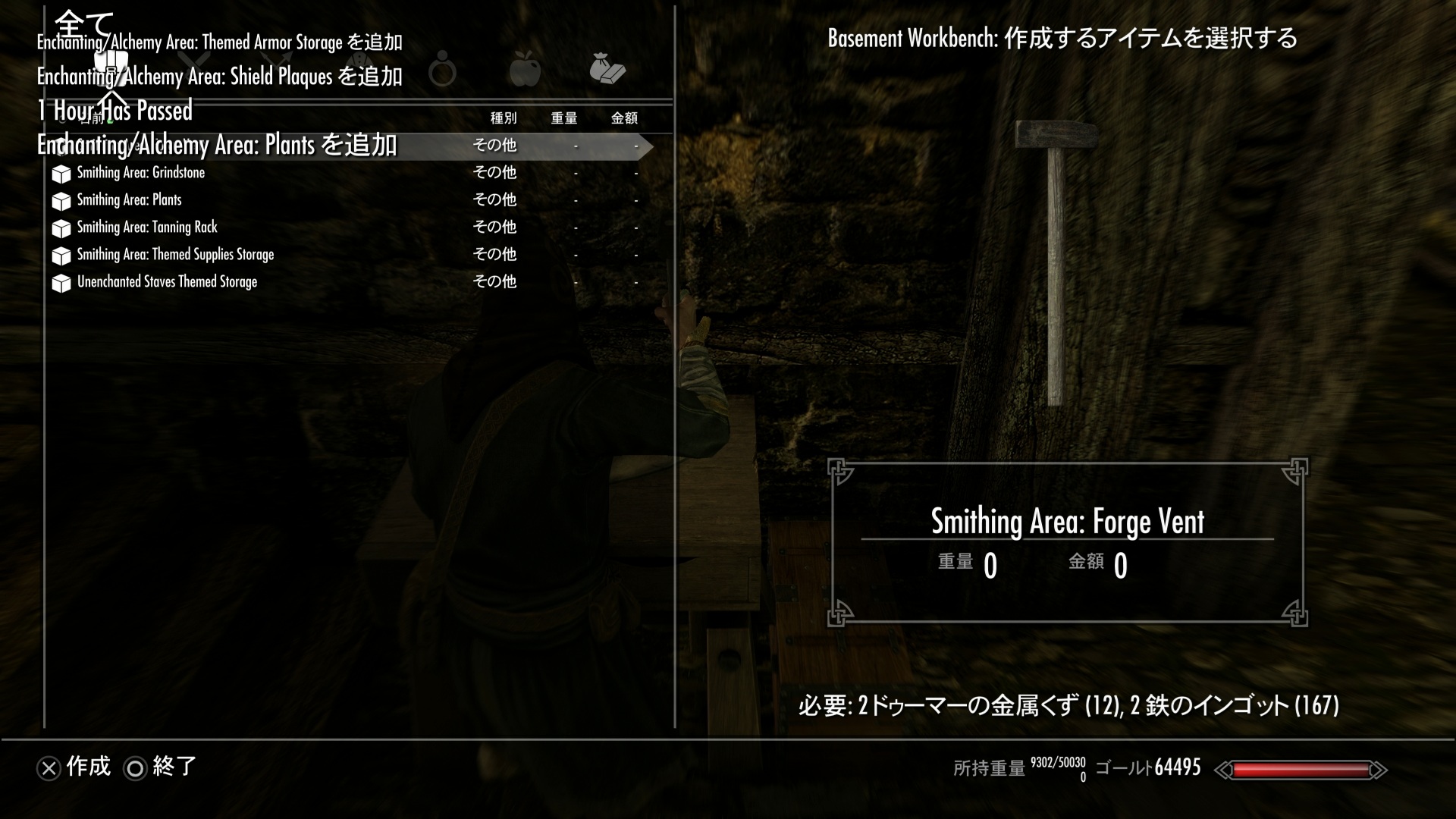 この「Smithing Area: Forge Vent」を作って鍛冶場を見るとクラッシュするようです。セラーナマネキンや他MODとの競合あるかもしれないが…。