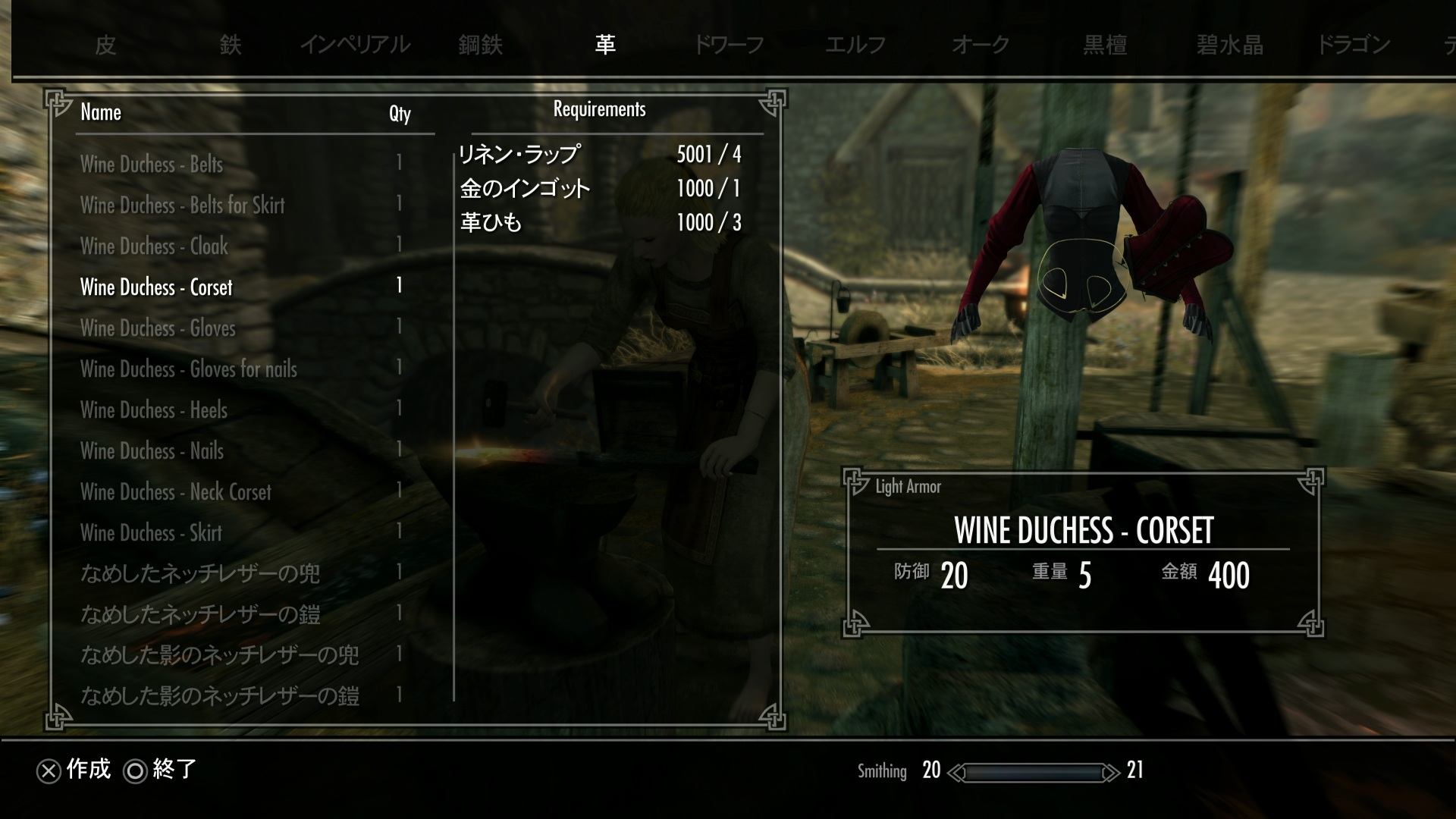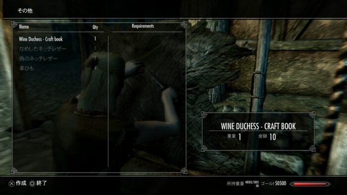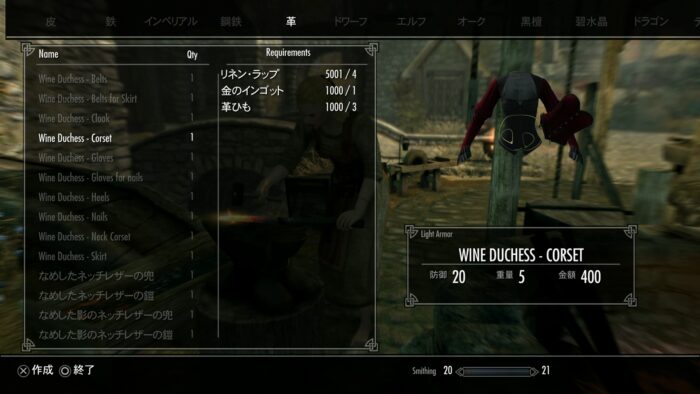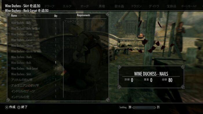 皮なめしの棚で本を作ると鍛冶で作れる。ネイルにアルトワインが必要。その他に防御力のない衣装版がある。
