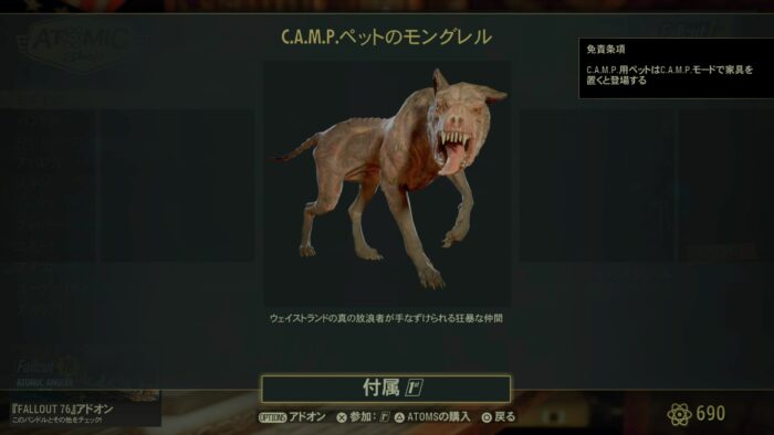 Fallout 1st 2025年11月特典:C.A.M.P.ペットのモングレル