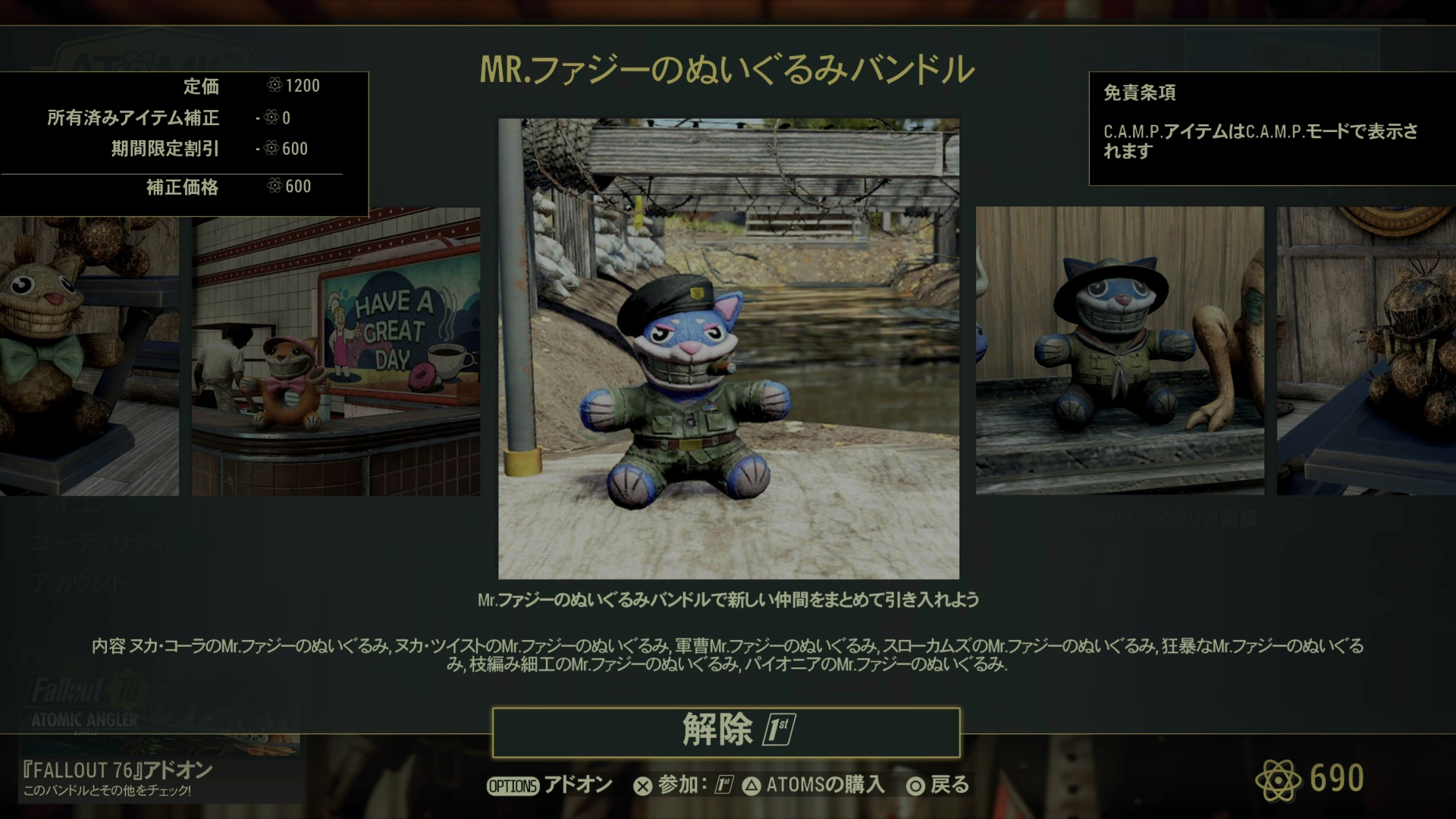 Fallout 1st限定セール:Mr.ファジーのぬいぐるみバンドル:600(50%オフ)