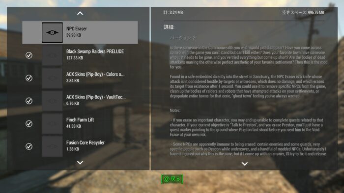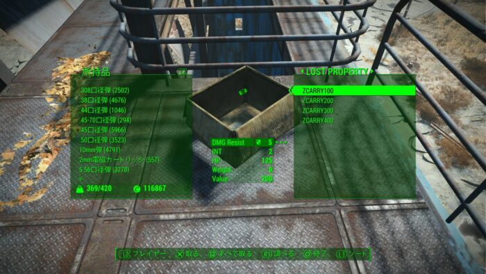 ただ、まえがきにも書いたようにクラッシュ3回。外からグッドネイバーに入る時に1回、倉庫から戻る時に2回。このMODの影響かもしれない(アイテムが増えて読み込みの負荷が大きいのでは?)。