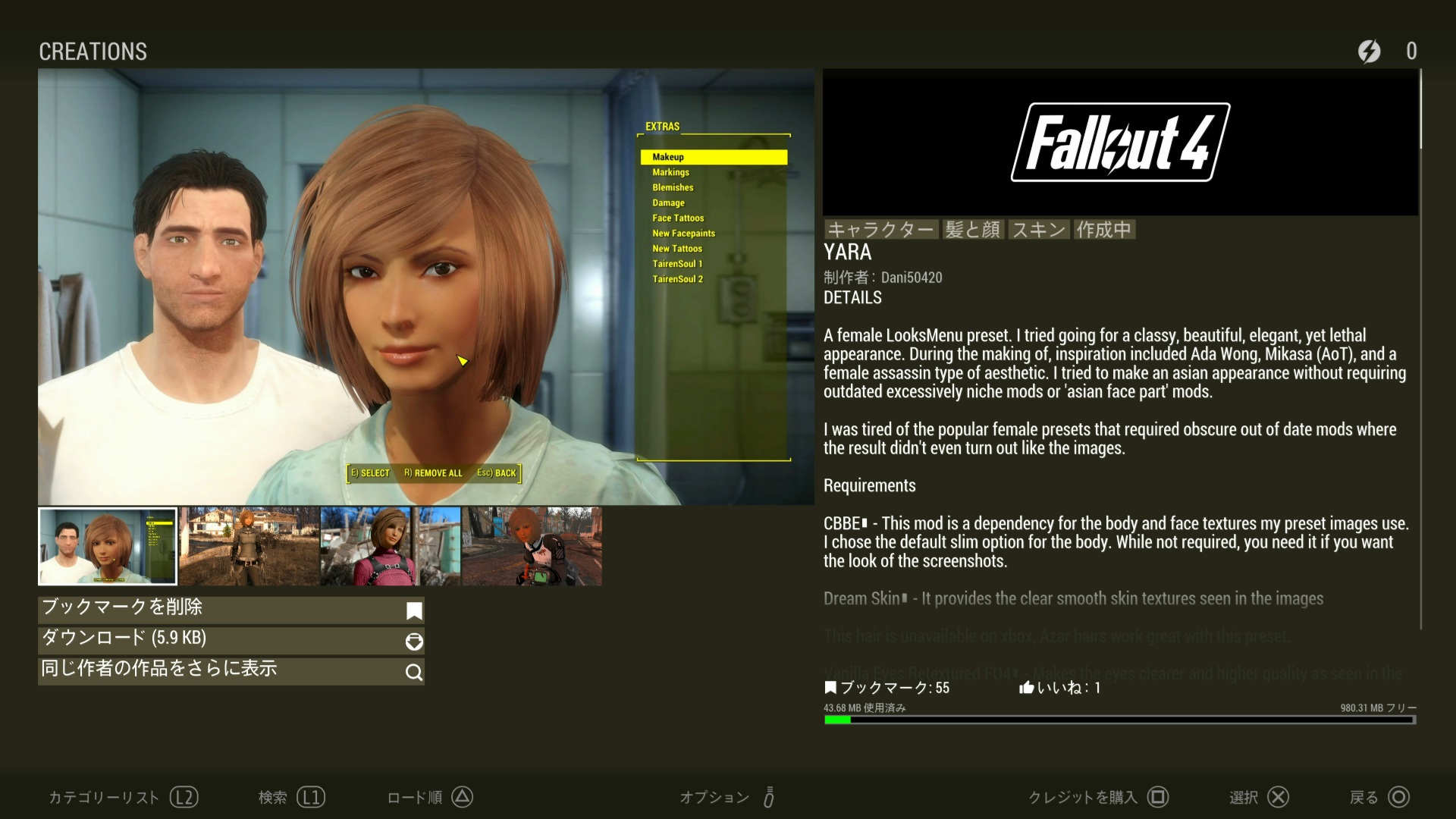 うーん、プリセットは変わっていなかった。パーツが追加されるのだろうか?わからなかった。そもそも要件のMODがPSにはないので、スクリーンショットの再現は難しいと思われる…。残念。