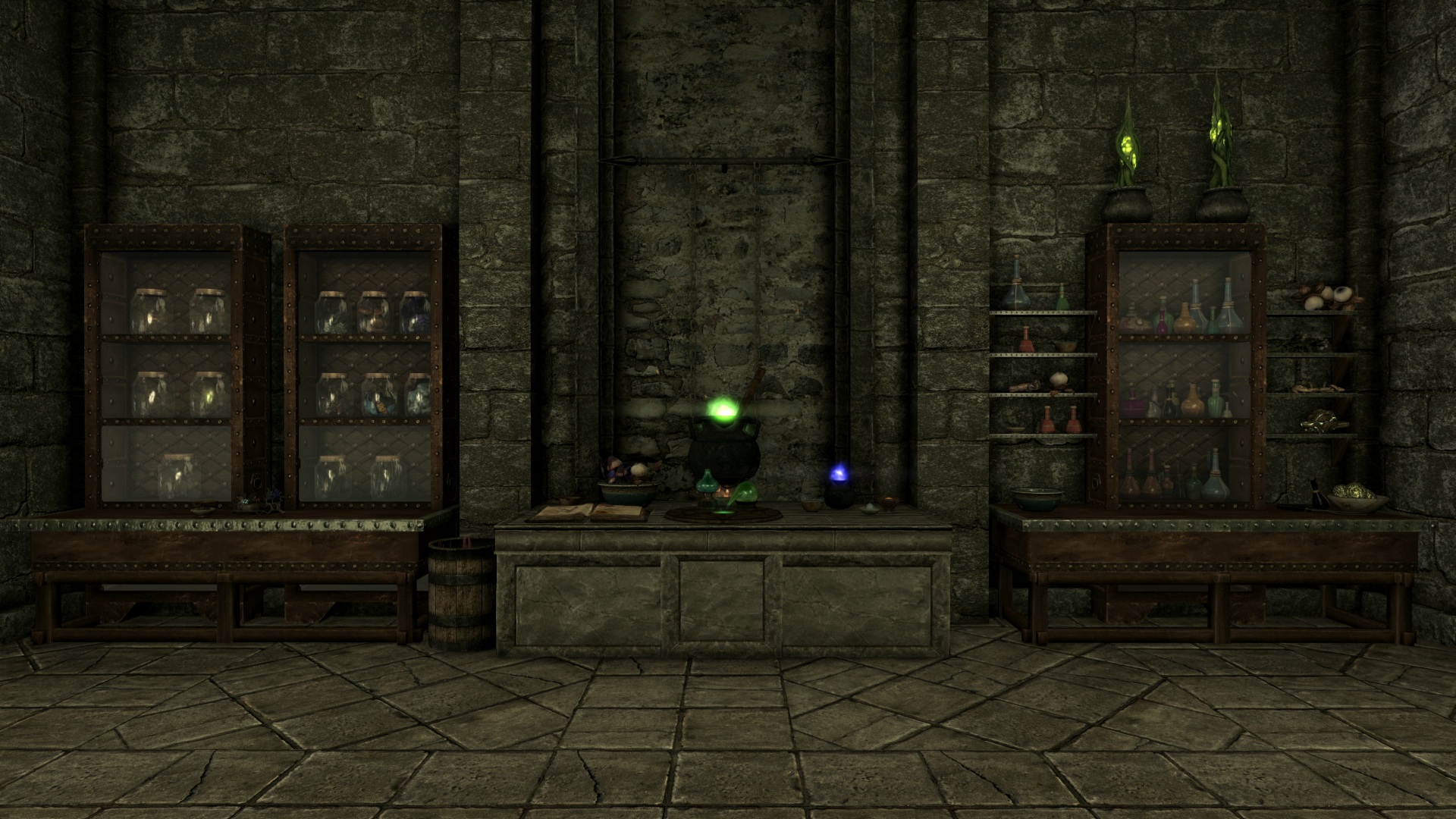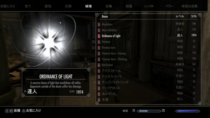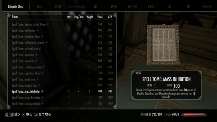 うーん、売ってない…。スキルレベルが足りないのかな?どうしても気になったので「Kittytails Spells AIO」を試してみた。さらにチートチェスト(ファレンガーの部屋にこの魔法が入った箱追加)も一緒に使った。