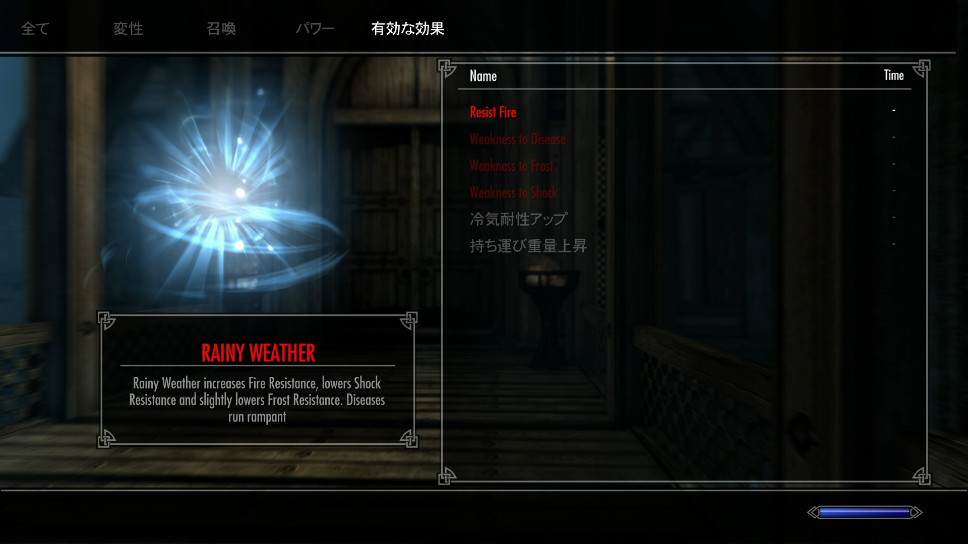 雨の時は炎に耐性バフ、他はデバフがかかるようだ。
