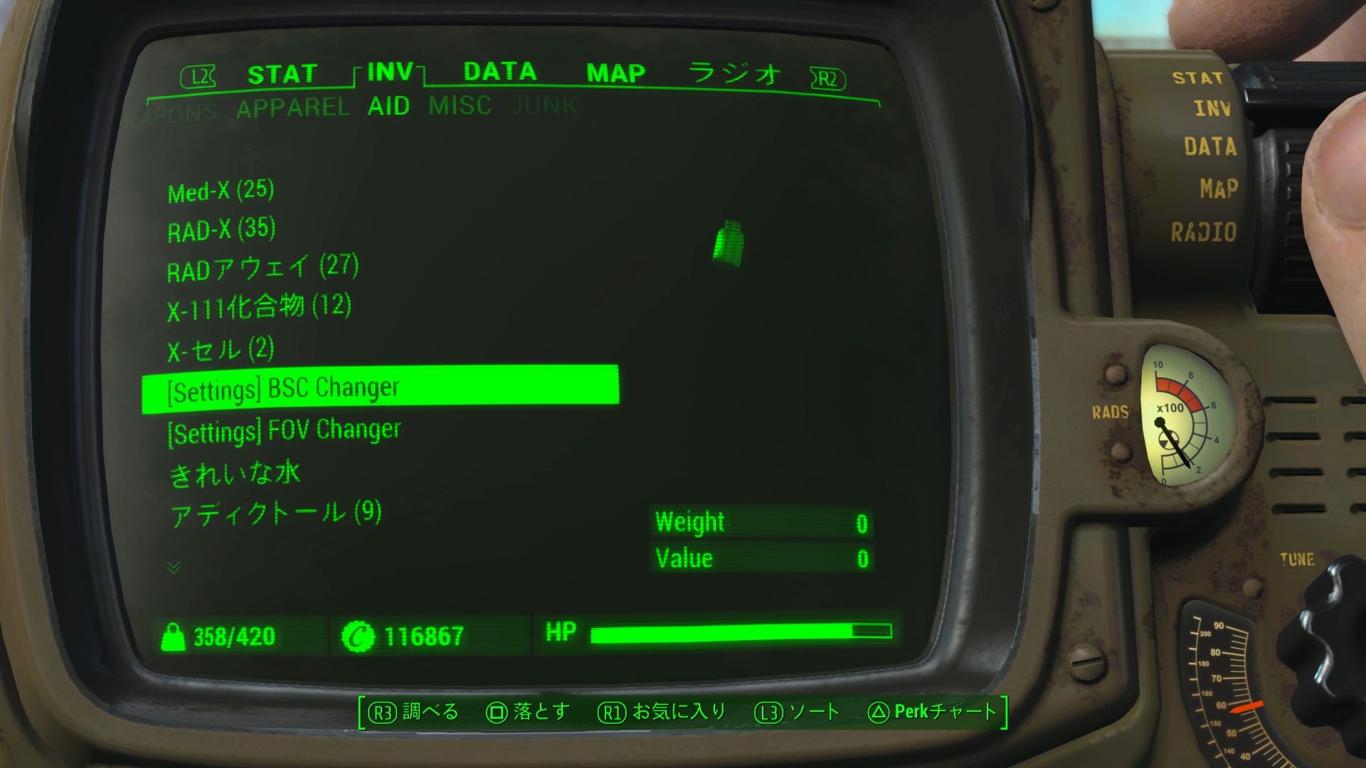 インベントリに追加されるAIDアイテムを使用する