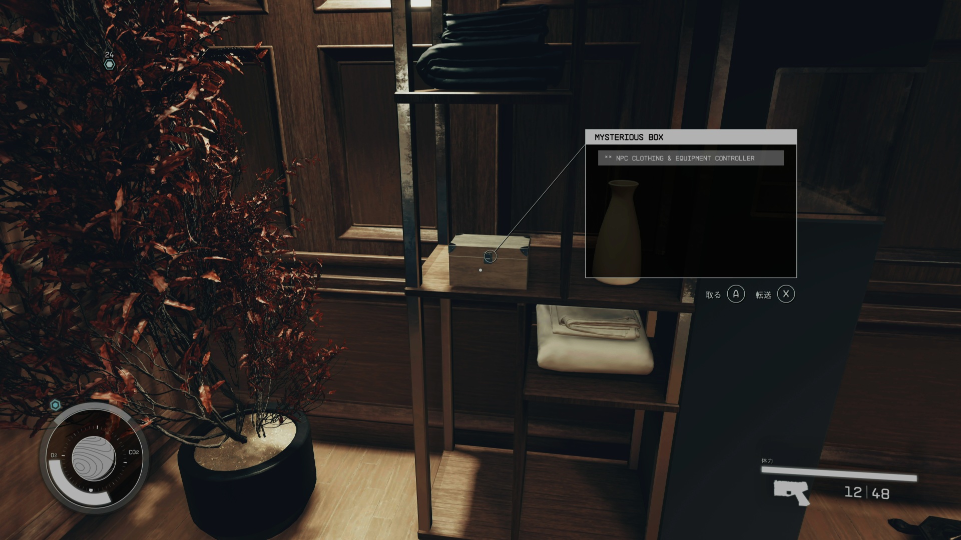 一部のNPCは隠し宇宙服を所持しているため、服を脱がせて奪うと、宇宙服を装備します。