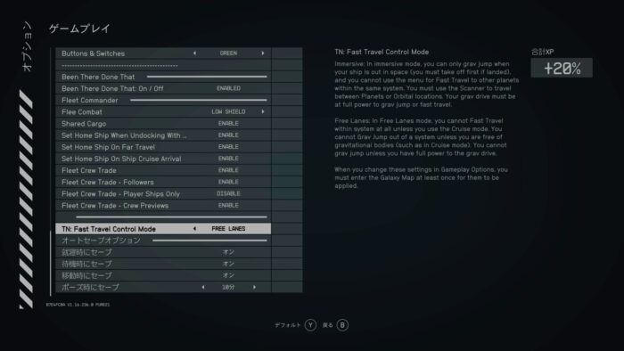 フリーレーンモード:フリーレーンモードでは、スキャナーによる高速移動も無効になり、場所から場所へ移動するにはクルーズモードを使用する必要があります。また、グラビティジャンプも制限されます。なぜなら、まず周囲の惑星の軌道から脱出する必要があるからです。惑星の磁気圏を損傷させたくないでしょうからね!